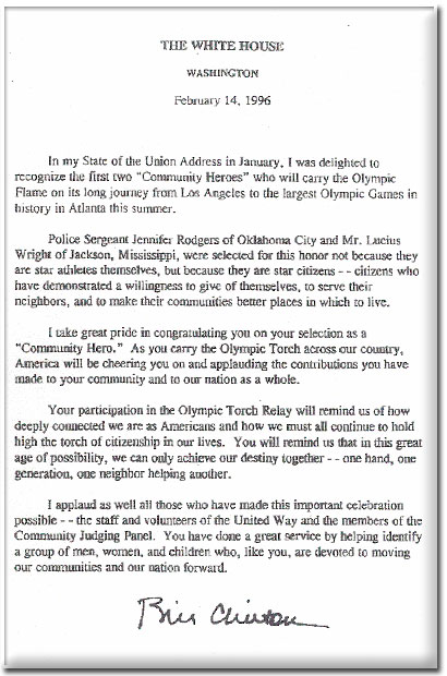 Recently was shown on local Jacksonville television commercial, holding his historic Olympic Torch for Saturn Dealership.